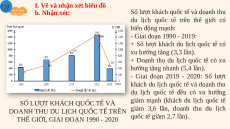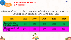 QUỐC TẾ TRÊN THẾ GIỚI, GIAI ĐOẠN 1990 - 2020 Năm 1990 2000 2010 2019 2020 Khách du lịch (triệu lượt người) 438 673 809 1466 402 Doanh thu du lịch (tỉ USD) 271 496 977 1466 533