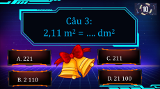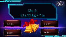 Câu 1: 3 tấn 112 kg = ? tấn A. 311,2 C. 31,12 B. 0,312 D. 3,112 Câu 2: 5 tạ 11 kg = ? tạ A. 5,11 C. 0,511 B. 0.51 D. 51,1