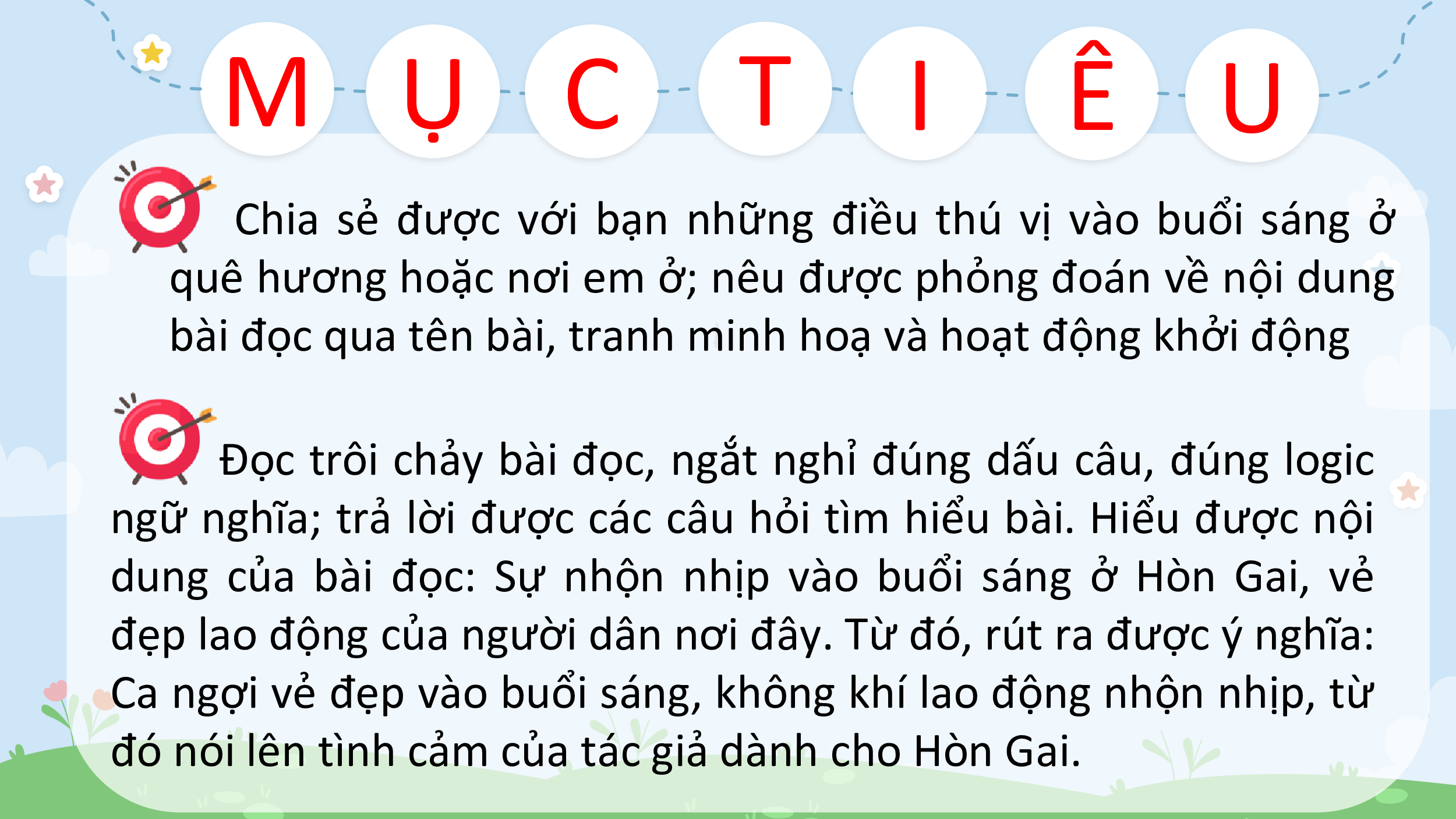 Thứ … ngày … tháng … năm … Tiếng Việt Bài 4 - tiết 1 BUỔI SÁNG Ở HÒN GAI www.9slide.vn M Ụ C T I Ê U