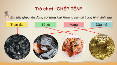Em hãy ghép tên đúng với từng loại khoáng sản có trong hình ảnh sau: Than đá Bô-xít Vàng Dầu mỏ