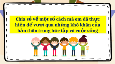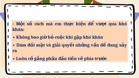 ố cách mà em đã th c ự hi n ệ đ ể vư t ợ qua nh n ữ g khó khăn c a ủ b n ả thân trong h c ọ t p ậ và cu c ộ s n ố g - M t ộ s ố cách mà em th c ự hi n ệ đ ể v t ượ qua khó khăn: + Không bao gi b ờ cu ỏ c kh ộ i g p ặ khó khăn + Dám đ i ố m t ặ và gi i ả quy t ế nh n ữ g v n ấ đ ề đang x y ả ra + Luôn c g ố ng p ắ h n đ ấ u ấ ti n v ế p ề hía tr c ướ