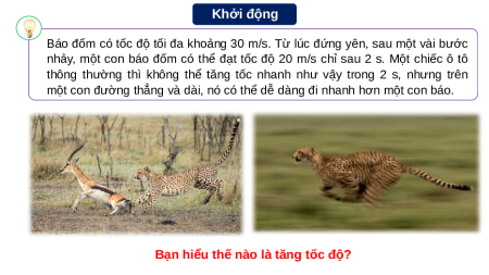 nhảy, một con báo đốm có thể đạt tốc độ 20 m/s chỉ sau 2 s. Một chiếc ô tô