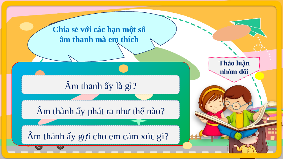 Chia sẻ với các bạn một số âm thanh mà em thích Thảo luận nhóm đôi Âm thanh ấy là gì?