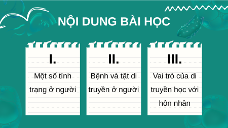 DI TRUYỀN HỌC NGƯỜI NỘI DUNG BÀI HỌC I. II. III. Một số tính Bệnh và tật di Vai trò của di trạng ở người truyền ở người truyền học với hôn nhân