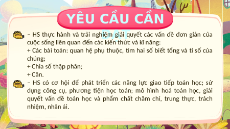 + Các bài toán: quan hệ phụ thuộc, tìm hai số biết tổng và tỉ số của chúng; + Chia số thập phân; + Cân.