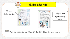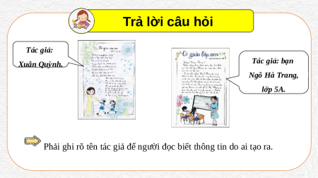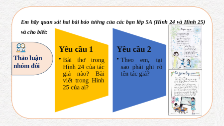 Em hãy quan sát hai bài báo tường của các bạn lớp 5A (Hình 24 và Hình 25) và cho biết: Yêu cầu 1 Yêu cầu 2 Thảo luận • Bài thơ trong • Theo em, tại nhóm đôi Hình 24 của tác sao phải ghi rõ giả nào? Bài tên tác giả? viết trong Hình 25 của ai? Trả lời câu hỏi Tác giả: Xuân Quỳnh.