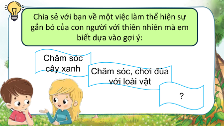 gắn bó của con người với thiên nhiên mà em biết dựa vào gợi ý: Chăm sóc cây xanh Chăm sóc, chơi đùa với loài vật ?