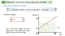 • Độ dốc của đường thẳng có = at giá trị bằng gia tốc. a 𝑣0 t 𝑣 −𝑣 𝑎= 0 0 𝑡 t(s) 𝑡