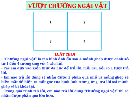 ậ ” là tên hình n ả h n ẩ sau 4 m n ả h ghép đư c ợ đánh s ố t ừ 1 đ n ế 4 tư n ơ g n ứ g v i ớ 4 câu h i. ỏ - Các em d a ự vào ki n ế th c ứ đã h c ọ đ ể tr ả l i, ờ m i ỗ câu h i ỏ có 1 lư t ợ tr ả lời. - Em nào tr ả l i ờ đúng sẽ nh n ậ đư c ợ 1 ph n ầ quà nh ỏ và m n ả g ghép sẽ bi n ế m t ấ đ ể hi n ệ ra m t ộ góc c a ủ hình nh ả tư ng ơ n ứ g, tr ả l i ờ sai m n ả h ghép sẽ b ị khóa l i ạ . - Trong quá trình tr ả l i, ờ em nào tr ả l i ờ đúng “Chư n ớ g ng i ạ v t ậ ” thì sẽ nh n ậ đư c ợ ph n ầ quà l n ớ h n ơ . V T C ƯỢ HƯ NG Ớ NG I Ạ V T Ậ 1 2 3 4