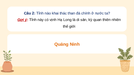 Câu 2: Tỉnh nào khai thác than đá chính ở nước ta?