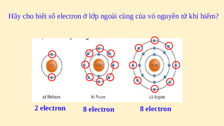 Hãy cho biết số electron ở lớp ngoài cùng của vỏ nguyên tử khí hiếm? 2 electron 8 electron 8 electron