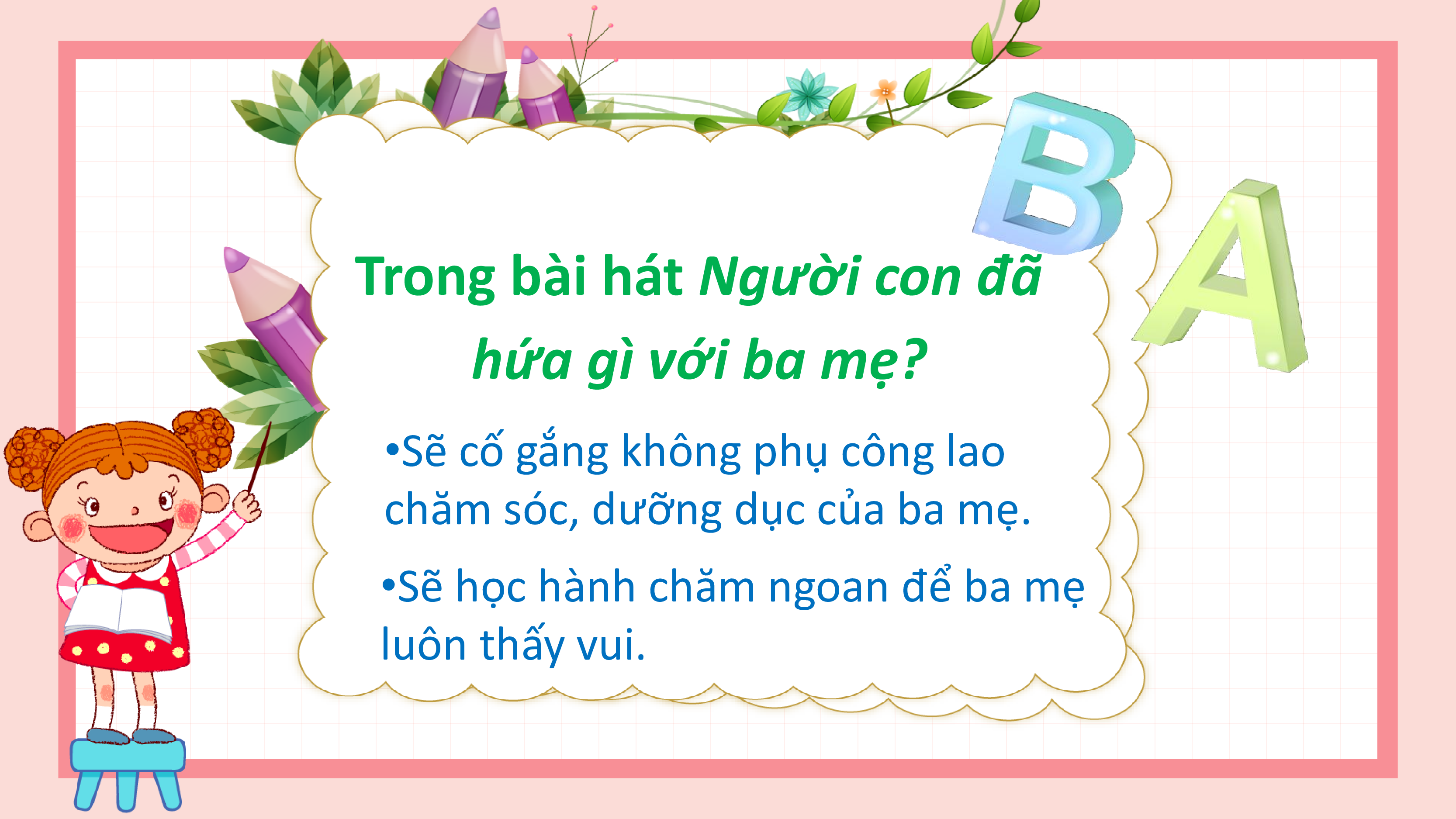 •Sẽ học hành chăm ngoan để ba mẹ luôn thấy vui. Đạo đức