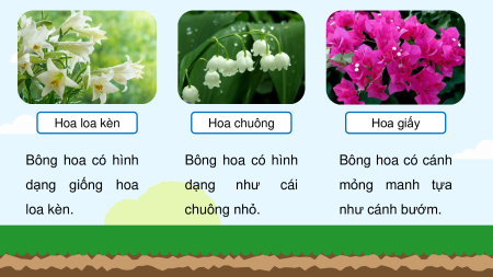 Trao đổi với bạn về tên gọi của mỗi loài hoa trong các bức ảnh dưới đây: Hoa loa kèn Hoa chuông Hoa giấy Hoa loa kèn Hoa chuông Hoa giấy Bông hoa có hình Bông hoa có hình Bông hoa có cánh dạng giống hoa dạng như cái mỏng manh tựa loa kèn. chuông nhỏ. như cánh bướm. KẾT LUẬN