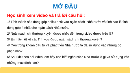 5/ Sau khi theo dõi video, em hãy cho biết ngân sách Nhà nước là gì và sử dụng vào những mục đích nào?