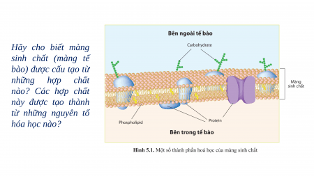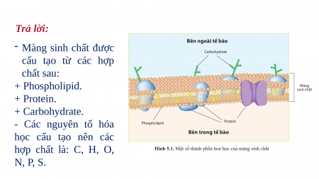 bào) được cấu tạo từ những hợp chất nào? Các hợp chất này được tạo thành từ những nguyên tố hóa học nào? Trả lời: - Màng sinh chất được cấu tạo từ các hợp chất sau: + Phospholipid. + Protein. + Carbohydrate. - Các nguyên tố hóa học cấu tạo nên các hợp chất là: C, H, O, N, P, S.