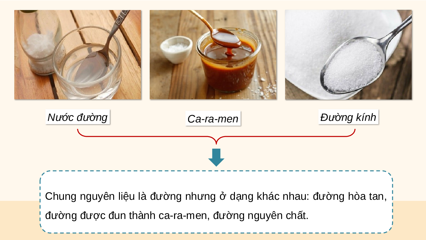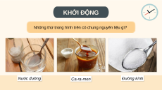 Những thứ trong hình trên có chung nguyên liệu gì? Nước đường Ca-ra-men Đường kính Nước đường Ca-ra-men Đường kính