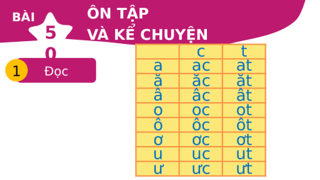 Bài học đầu tiên của thỏ con BÀI ÔN TẬP 5 VÀ KỂ CHUYỆN 0 c t 1 Đọc a ac at ă ăc ăt â âc ât o oc ot ô ôc ôt ơ ơc ơt u uc ut ư ưc ưt