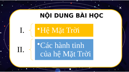 BÀI 54: HỆ MẶT TRỜI NỘI DUNG BÀI HỌC I. •Hệ Mặt Trời • II. Các hành tinh của hệ Mặt Trời
