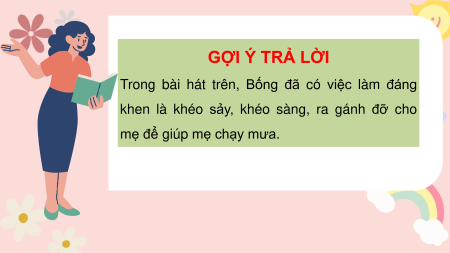 Các em nghe bài hát Cái bống và trả lời câu hỏi: Trong bài hát, Bống đã có việc làm gì đáng khen? GỢI Ý TRẢ LỜI