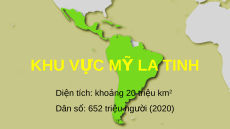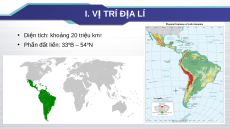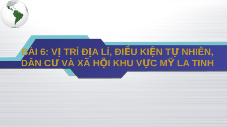 LOGO ĐỊA LÍ 11 – K T Ế N I Ố TRI TH C Ứ PH N Ầ HAI: Đ A Ị LÍ KHU V C Ự VÀ QUỐC GIA Gv: Tr n ầ Th ịHà KHU V C Ự M Ỹ LA TINH Di n tí ệ ch: kho n ả g 20 tri u ệ km2 Dân số: 652 tri u ng ệ i ườ (2020) LOGO BÀI 6: V TR Ị Í Đ A Ị LÍ, ĐI U Ề KI N Ệ T N Ự HIÊN, DÂN C Ư VÀ XÃ H I Ộ KHU V C Ự M LA Ỹ TINH N I Ộ DUNG BÀI H C Ọ 1 1 V Ị TRÍ R Đ A Ị A LÍ 2 ĐI Đ ỀU U KI K N Ệ N TỰ T NH N I H ÊN Ê N VÀ VÀ TÀ T I À 2 NG N UYÊ U N YÊ N THI H ÊN Ê N NH N I H ÊN Đị Đ a a hì h nh h và và đ t ấ Kh K í h hậu Sôn Sô g n , hồ Sin Si h h vật Kh K o h án á g n g sả s n Bi B ển 3 3 DÂ D N Â N CƯ C VÀ VÀ XÃ X Ã H I Ộ Dâ D n n cư Đô Đ ô th ịhóa ó Xã X h i ộ