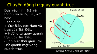 I. Chuyển động tự quay quanh trục Dựa vào hình 6.1 và thông tin trong bài, em hãy: - Xác định: + Cực Bắc, cực Nam và trục của Trái Đất. + Hướng tự quay quanh trục của Trái Đất.
