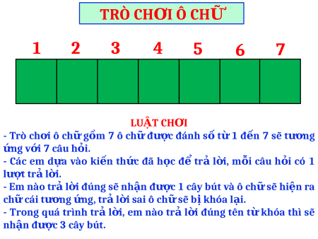 TRÒ CH I Ơ Ô CHỮ 1 2 3 4 5 6 7 LU T C Ậ H I Ơ - Trò ch i ơ ô ch ữ g m ồ 7 ô ch ữ đư c ợ đánh s ố t ừ 1 đ n ế 7 sẽ tư ng ơ ng v ứ i ớ 7 câu h i ỏ . - Các em d a ự vào ki n ế th c ứ đã h c ọ đ ể tr ả l i, ờ m i ỗ câu h i ỏ có 1 lư t tr ợ ả l i. ờ - Em nào tr l ả i đ ờ úng sẽ nh n đ ậ ư c 1 ợ