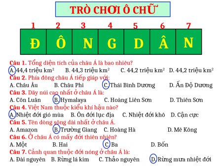 cây bút và ô ch sẽ ữ hi n ệ ra ch cái t ữ ư ng ơ ng ứ , tr l ả i sai ô ch ờ sẽ ữ b k ị hóa l i ạ . - Trong quá trình tr ả l i, ờ em nào tr ả l i ờ đúng tên t ừ khóa thì sẽ nhận đư c ợ 3 cây bút. TRÒ CH I Ơ Ô CHỮ 1 2 3 4 5 6 7 Đ Ô N G D Â N Câu 1. Tổng di n t ệ ích c a ủ châu Á là bao nhiêu?