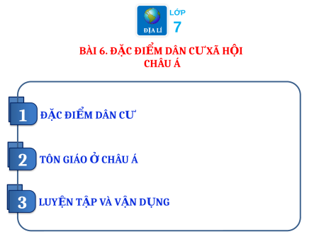 ĐẶC ĐIỂM DÂN C , XÃ H Ư I Ộ CHÂU Á LỚP ĐỊA LÍ 7 BÀI 6. Đ C Ặ ĐI M Ể DÂN C XÃ Ư H I Ộ CHÂU Á Đ C 1 Ặ ĐI M D Ể ÂN CƯ TÔN GIÁO C Ở HÂU Á 2 LUY N T Ệ P V Ậ À V N D Ậ NG Ụ 3