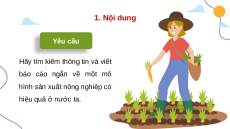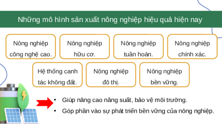 Những mô hình sản xuất nông nghiệp hiệu quả hiện nay Nông nghiệp Nông nghiệp Nông nghiệp Nông nghiệp công nghệ cao. hữu cơ. tuần hoàn. chính xác. Hệ thống canh Nông nghiệp Nông nghiệp tác không đất. đô thị. bền vững.