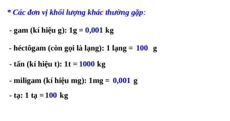 - miligam (kí hiệu mg): 1mg = 0,001 g - tạ: 1 tạ = 100 kg
