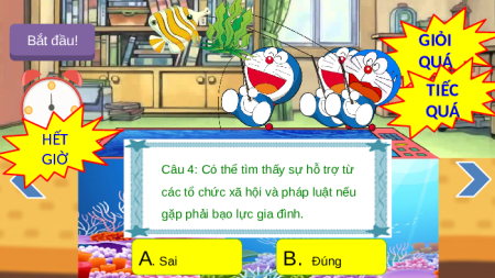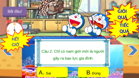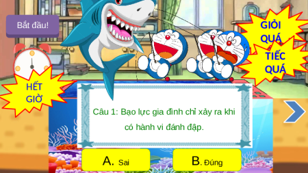 Câu 1: Bạo lực gia đình chỉ xảy ra khi có hành vi đánh đập. A. Sai B. Đúng Bắt đầu! GIỎI QUÁ TIẾC QUÁ HẾT GIỜ