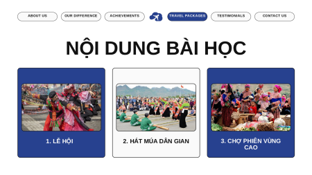 DU VÀ MIỀN NÚI BẮC BỘ ABOUT US OUR DIFFERENCE ACHIEVEMENTS TRAVEL PACKAGES TESTIMONIALS CONTACT US NỘI DUNG BÀI HỌC 1. LỄ HỘI 2. HÁT MÚA DÂN GIAN 3. CHỢ PHIÊN VÙNG CAO