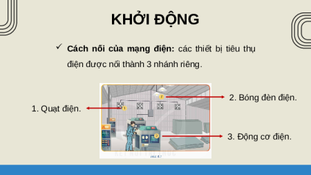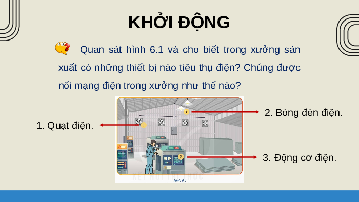 nối mạng điện trong xưởng như thế nào? 2. Bóng đèn điện. 1. Quạt điện. 3. Động cơ điện. KHỞI ĐỘNG