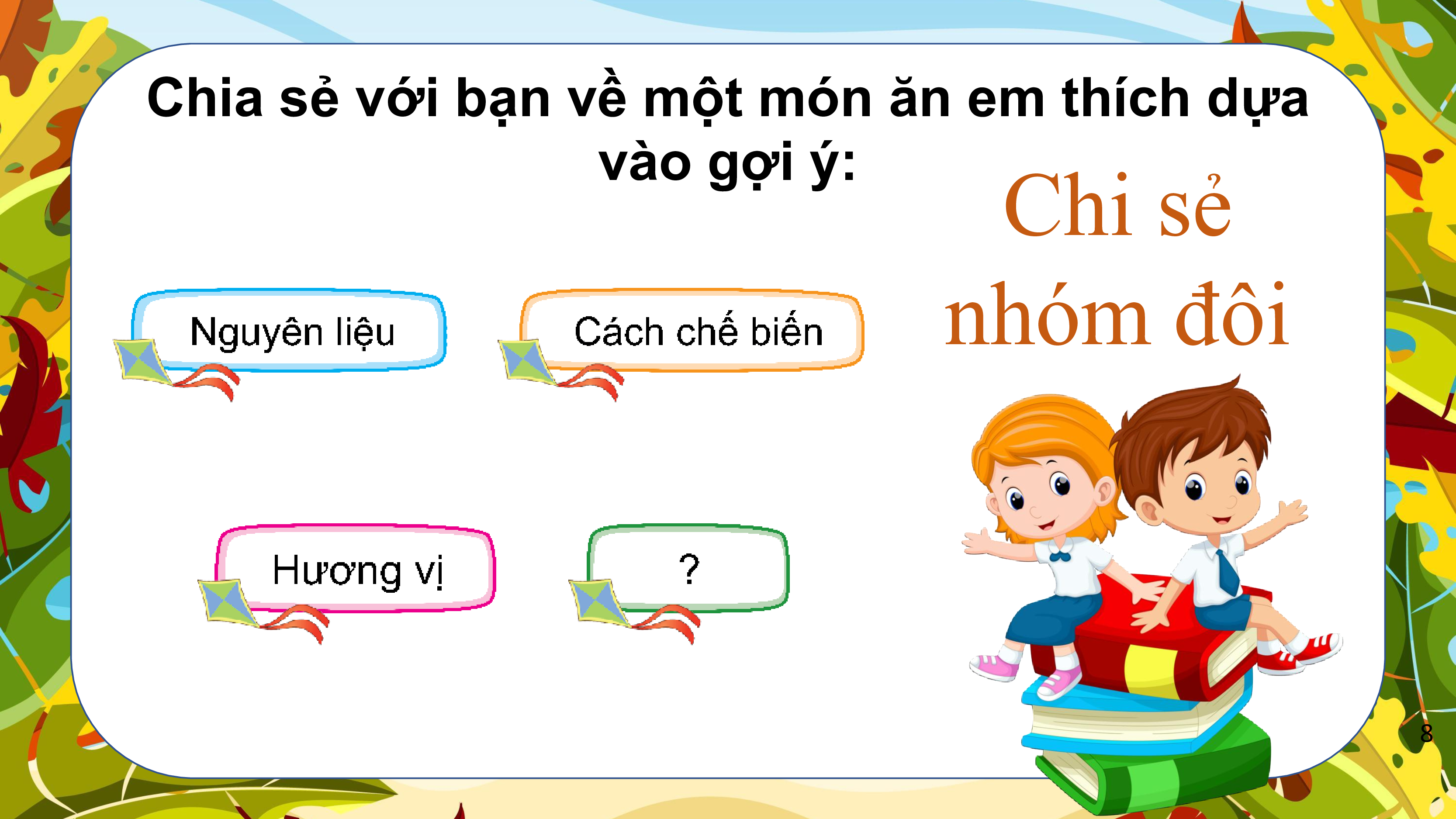 Chia sẻ với bạn về một món ăn em thích dựa vào gợi ý: Chi sẻ nhóm đôi 8 www.9slide.vn Tranh vẽ gì ?
