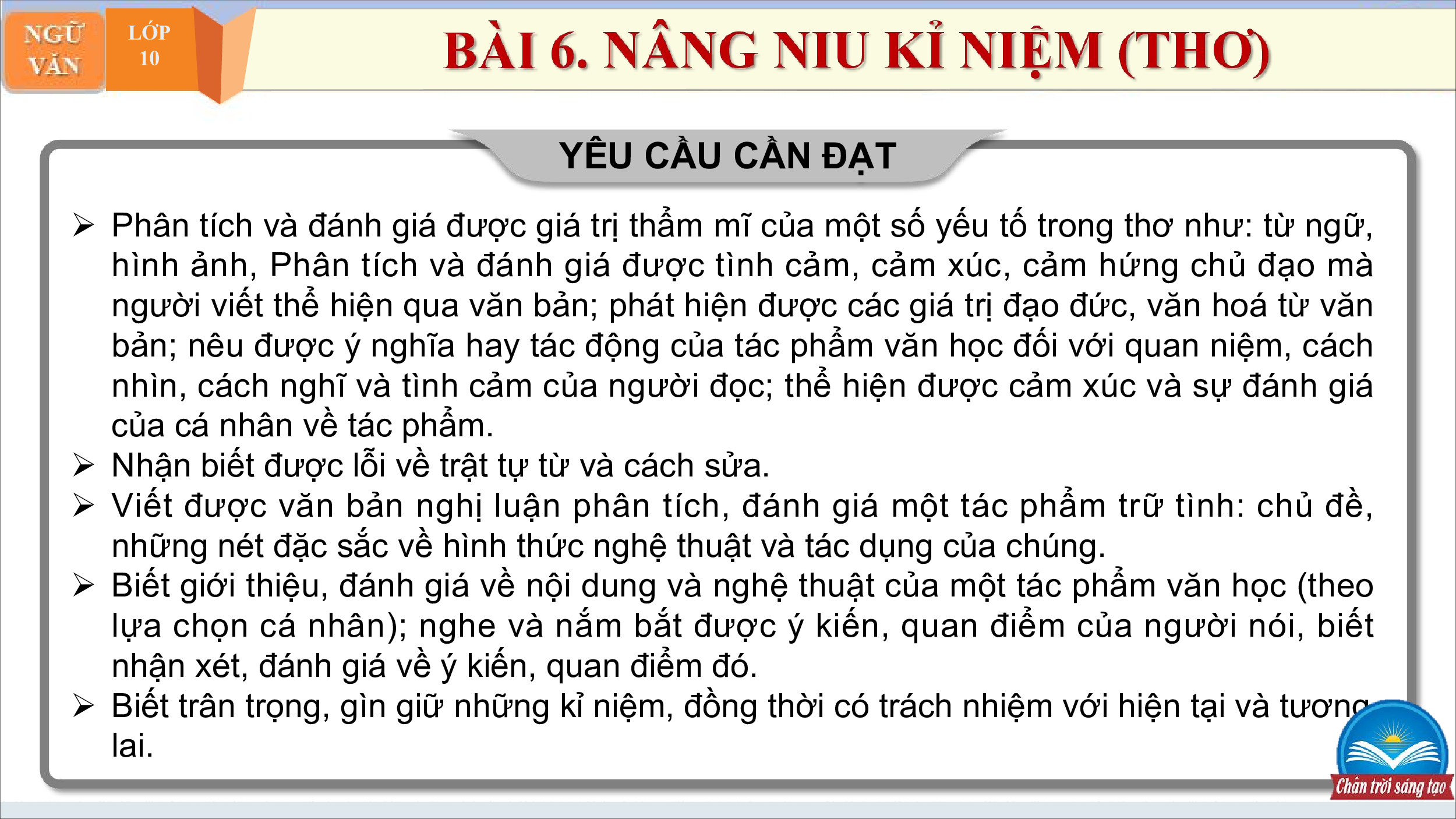 LỚP 10 Bài 6: NÂNG NIU KỈ NIỆM LỚP 10 YÊU CẦU CẦN ĐẠT
