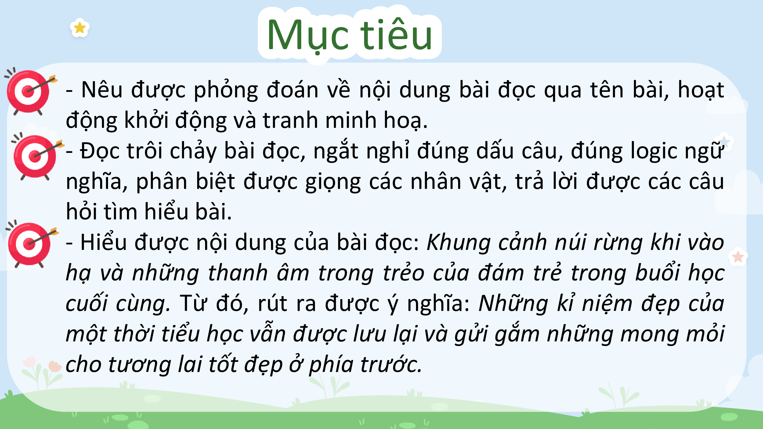 - Hiểu được nội dung của bài đọc: Khung cảnh núi rừng khi vào