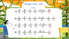 Bài tập 1 SGK – tr83 Tính. 2 4 6 4 6 + 4 10 a) + = + = = 3 9 9 9 9 9 1 2 1 4 1 + 4 5 1 b) + = + = = = 10 5 10 10 10 10 2 7 3 7 6 7 – 6 1 c) – = – = = 22 11 22 22 22 22 5 5 10 5 10 – 5 5 d) – = – = 6 12 12 12 = 12 12