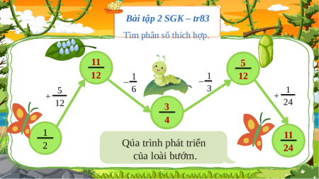 Bài tập 2 SGK – tr83 Tìm phân số thích hợp. 11 5 ? ? 12 1 1 12 – – 5 6 3 1 + + 12 24 3?4 1 11 2 Qúa trình phát triển ? 24 của loài bướm.
