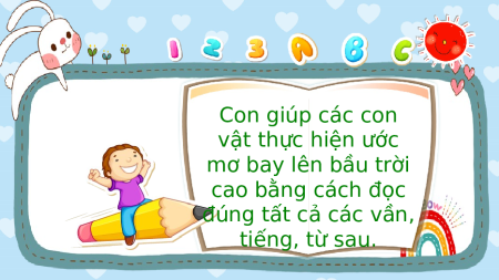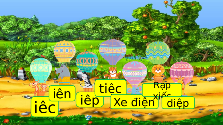 HT Chào mừng các em đến với môn Tiếng Việt Design by: Hương Thảo BAY LÊN NÀO Con giúp các con vật thực hiện ước mơ bay lên bầu trời cao bằng cách đọc đúng tất cả các vần, tiếng, từ sau. Rạp iên tiệc xiếc iêc iêp Xe điện diệp