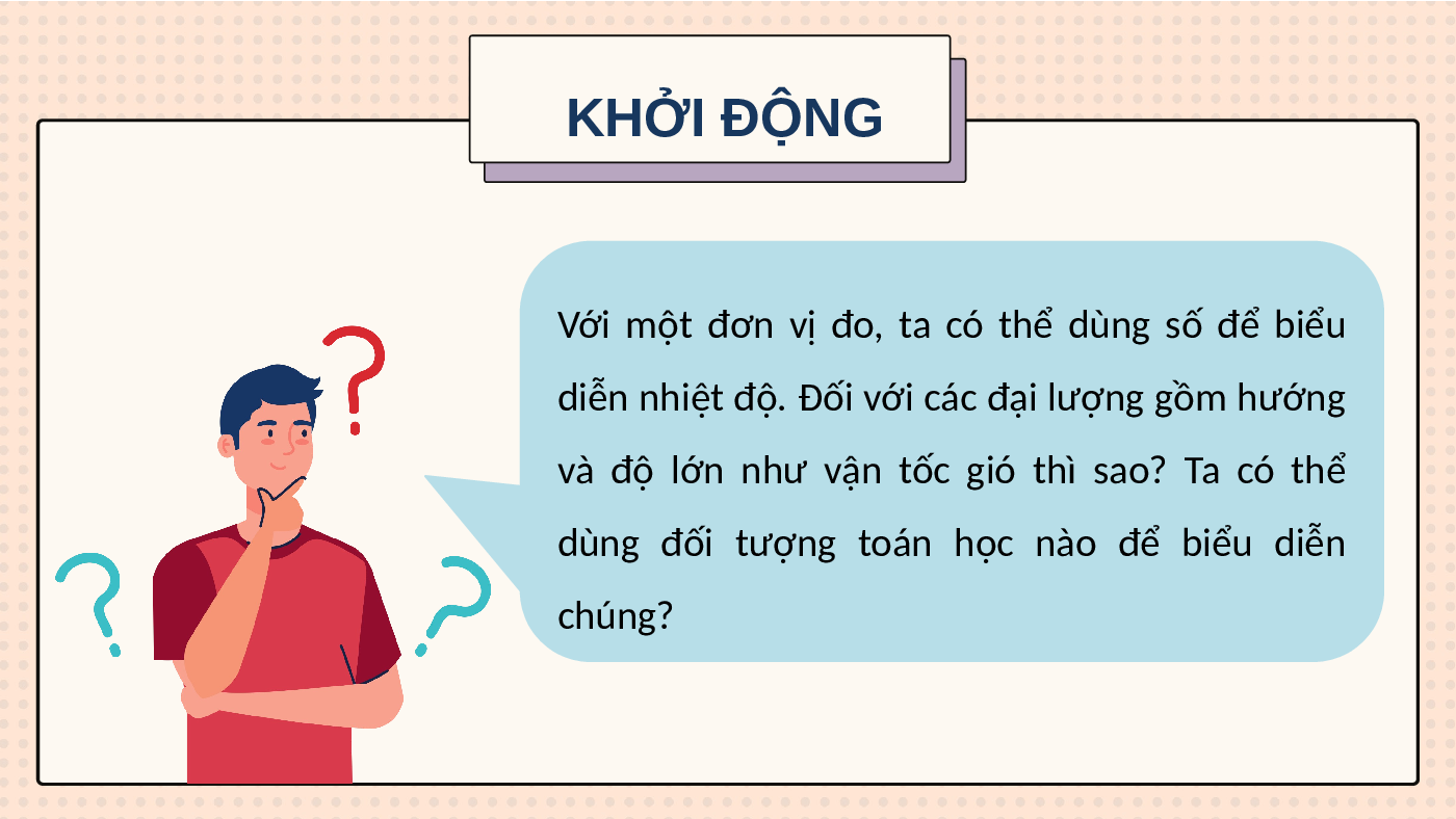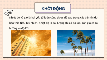 báo thời tiết. Tuy nhiên, nhiệt độ là đại lượng chỉ có độ lớn, còn gió có cả hướng và độ lớn. KHỞI ĐỘNG