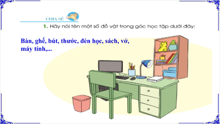 Bàn, ghế, bút, thước, đèn học, sách, vở, máy tính,. .