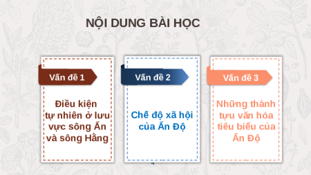 hình thành, phát triển nền văn minh Ấn Độ cổ đại? 3 NỘI DUNG BÀI HỌC Vấn đề 1 Vấn đề 2 Vấn K đề 3 Điều kiện Những thành tự nhiên ở lưu Chế độ xã hội tựu văn hóa vực sông Ấn của Ấn Độ tiêu biểu của và sông Hằng Ấn Độ 4
