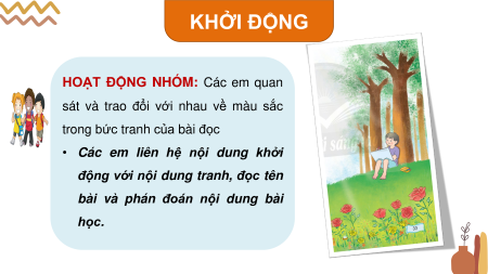 bài và phán đoán nội dung bài học. BÀI 7: SẮC MÀU TIẾT 1 + 2: ĐỌC NỘI DUNG