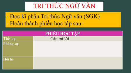 - Hoàn thành phiếu học tập sau: PHIẾU HỌC TẬP Thể loại Câu trả lời Phóng sự Hồi kí