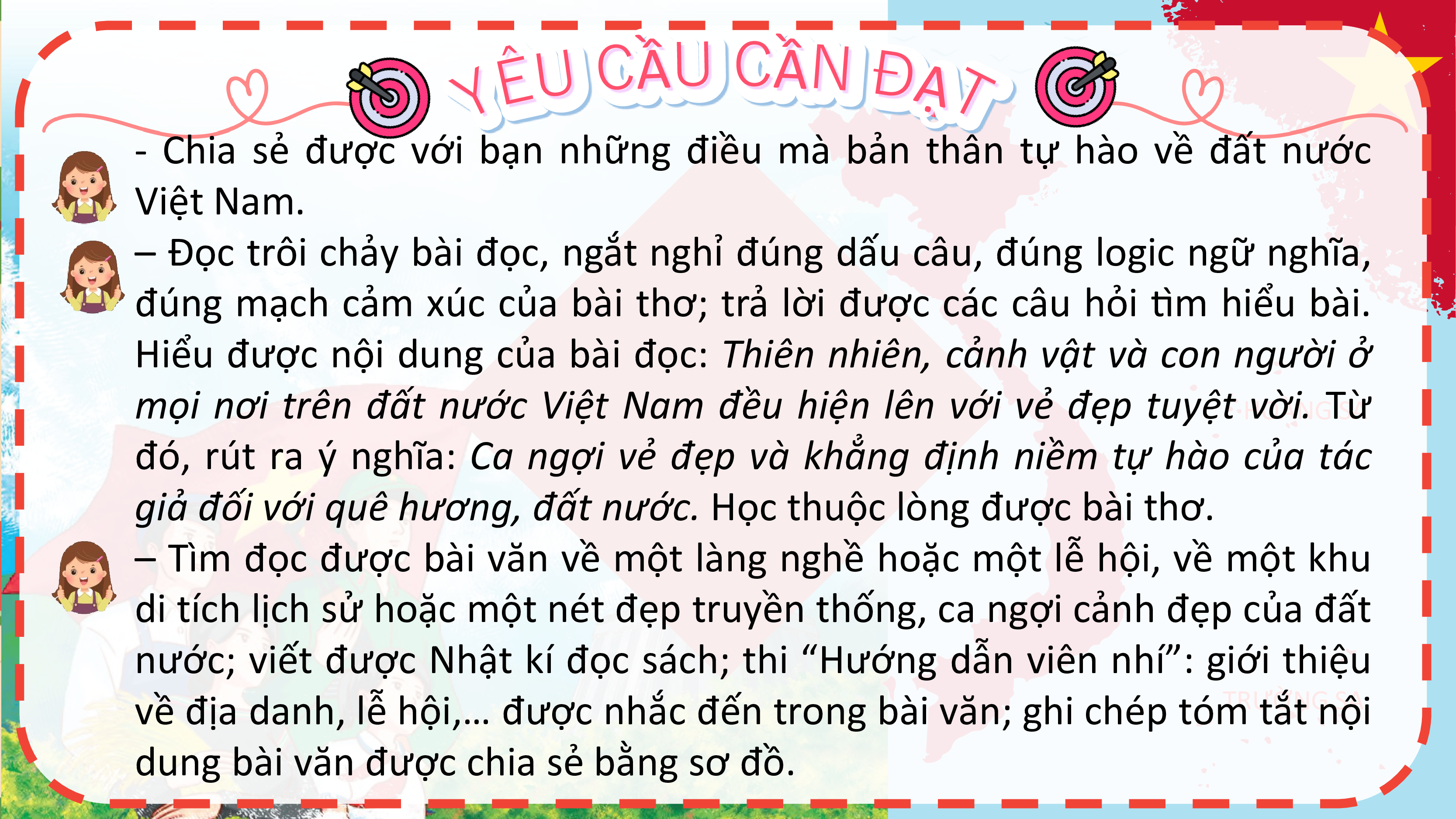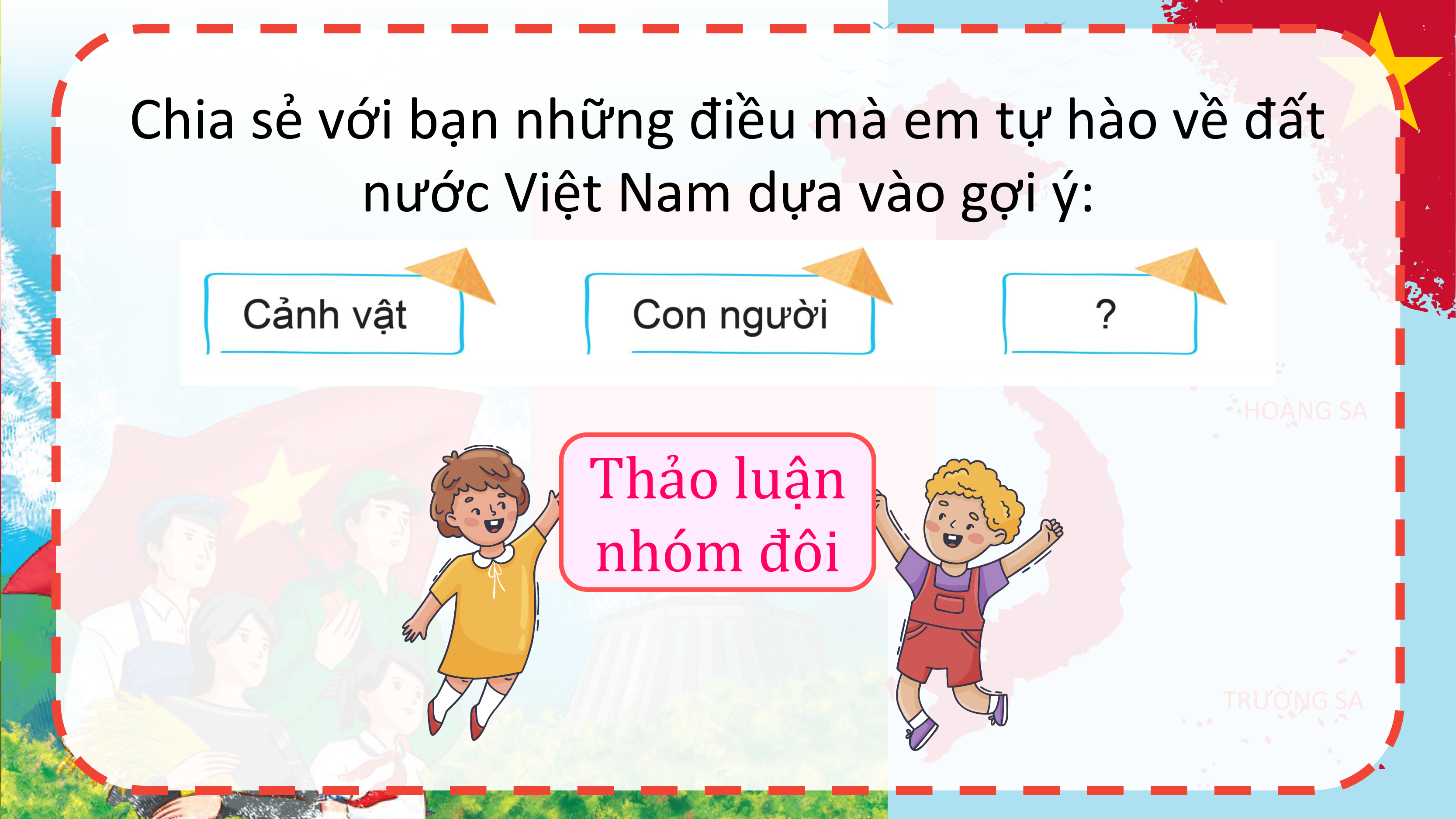 - Chia sẻ được với bạn những điều mà bản thân tự hào về đất nước Việt Nam.