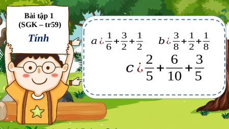 EM LÀM ĐƯỢC NHỮNG GÌ? Bài tập 1 (SGK – tr59) Tính 1 3 1 3 1 1 𝑎 ¿ + + 𝑏 ¿ + + 6 2 2 8 2 8 2 6 3 𝑐 ¿ + + 5 10 5 𝟏 𝟑 𝟏 1 9 3 1 𝟏𝟑 𝒂 +9 +3