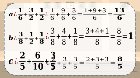 ¿ 𝟔 + 𝟐 +𝟐¿ + + = = 6 6 6 6 𝟔 3 4 1 3 8 𝟑 𝟏 𝟏 +4+1 𝒃 ¿ ¿ + + = = =𝟏