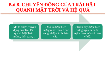 QUANH MẶT TRỜI VÀ HỆ QUẢ - Mô tả được chuyển - Mô tả được hiện - Trình bày được hiện động của Trái Đất tượng mùa: mùa ở các tượng ngày đêm đài quanh Mặt Trời: vùng vĩ độ và các bán ngắn theo mùa và theo hướng, thời gian,... cầu. vĩ độ.