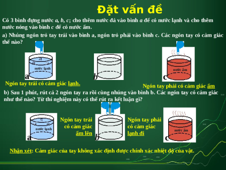 a) Nhúng ngón trỏ tay trái vào bình a, ngón trỏ phải vào bình c. Các ngón tay có cảm giác thế nào? nước lạnh nước ấm a b c