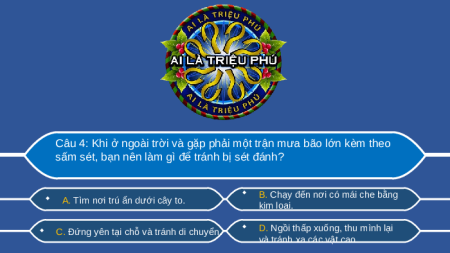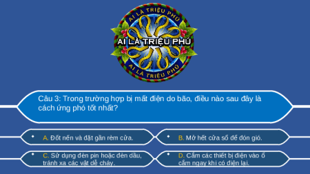 Câu 3: Trong trường hợp bị mất điện do bão, điều nào sau đây là cách ứng phó tốt nhất?
